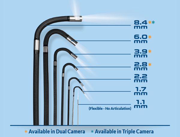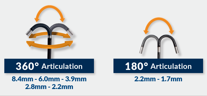 Available in 1.1mm to 8.4mm diameters. The thumb-activated joystick provides precise control of the articulating tip and responds to the slightest movement in all directions.